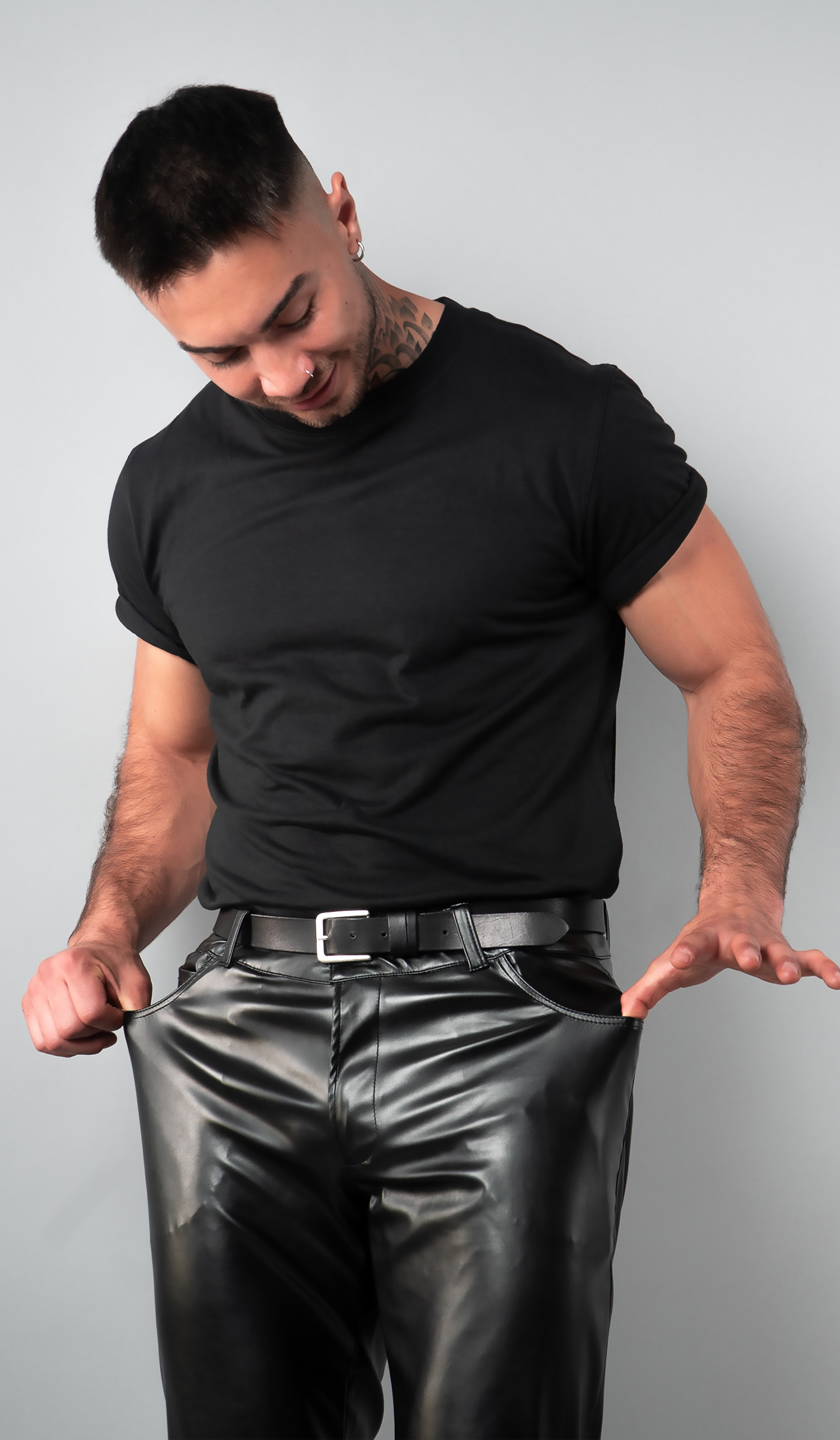 Pantalón en ecocuero elasticado. Diseño skinny. Bolsillos frontales y detalle de bolsillos de vivo en espalda. Cierre frontal con cremallera y botón.